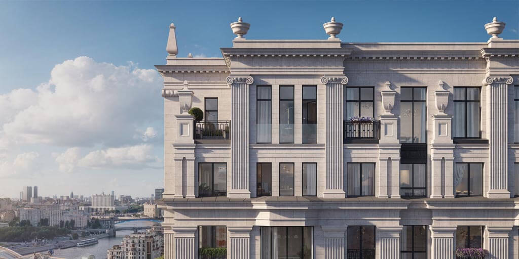 Архитектурная концепция ЖК «Хамовники 12» основана на классических принципах, которые проверены временем и остаются актуальными. Элегантные формы, симметрия, гармоничные пропорции и внимание к деталям делают этот дом образцом архитектурного искусства. В отличие от традиционных построек, здание ориентировано на круговой обзор, благодаря чему каждая из четырех сторон обладает статусом парадной.