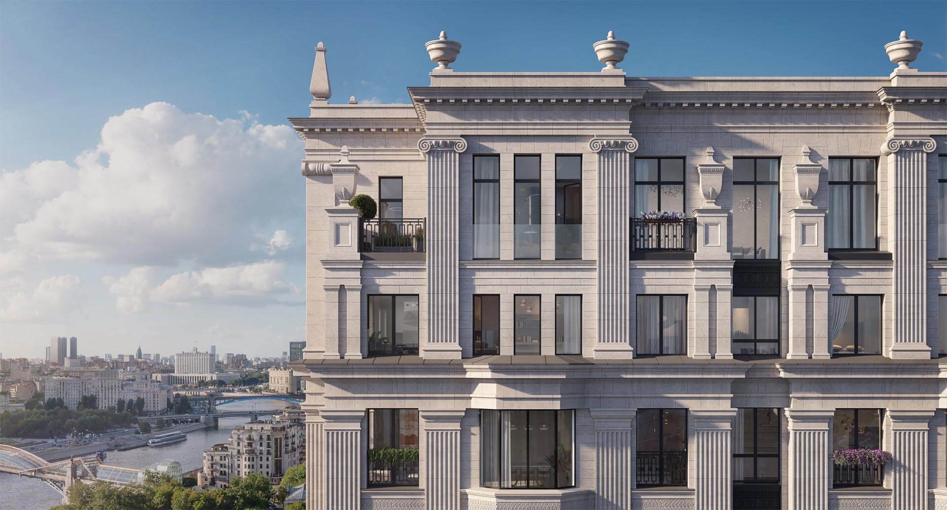 Особое внимание уделено деталям: дровяные камины создают атмосферу уюта, а панорамные террасы позволяют наслаждаться захватывающими видами. Один из пентхаусов располагает собственным бассейном, откуда открывается панорама Москвы-реки и других столичных достопримечательностей.
